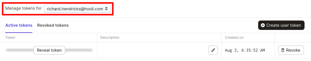 To revoke an existing token for another user, select the user from the Manage tokens for dropdown: